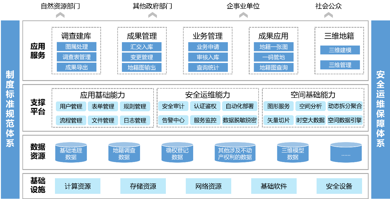 以計(jì)算資源、存儲(chǔ)資源、網(wǎng)絡(luò)資源等基礎(chǔ)設(shè)施為基石,深度匯聚融合基礎(chǔ)地理數(shù)據(jù)、地籍調(diào)查數(shù)據(jù)、確權(quán)登記數(shù)據(jù)、不動(dòng)產(chǎn)權(quán)利相關(guān)數(shù)據(jù)及三維模型數(shù)據(jù),構(gòu)建地籍?dāng)?shù)據(jù)庫。依托應(yīng)用基礎(chǔ)、安全運(yùn)維、空間基礎(chǔ)等核心能力,聚焦自然資源部門、其他政府部門、企事業(yè)單位及社會(huì)公眾等多元用戶需求,打造新時(shí)代地籍管理系統(tǒng),包括調(diào)查建庫、成果管理、業(yè)務(wù)管理、成果應(yīng)用等子系統(tǒng)及三維地籍?dāng)U展模塊,覆蓋“地籍調(diào)查建庫-數(shù)據(jù)質(zhì)量檢查-數(shù)據(jù)動(dòng)態(tài)更新-數(shù)據(jù)統(tǒng)一管理-成果共享應(yīng)用”等關(guān)鍵環(huán)節(jié),為地籍調(diào)查全流程提供堅(jiān)實(shí)有力的信息化支撐,構(gòu)建地籍調(diào)查規(guī)范化管理新模式,驅(qū)動(dòng)地籍管理模式變革、方式重塑、應(yīng)用創(chuàng)新,為自然資源管理現(xiàn)代化注入強(qiáng)勁動(dòng)力。