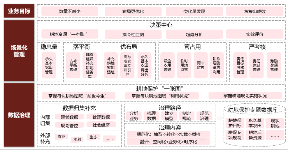 耕地保護(hù)業(yè)務(wù)眾多,但業(yè)務(wù)系統(tǒng)多以垂管系統(tǒng)為主,自建系統(tǒng)薄弱,阻礙了耕地保護(hù)一體化數(shù)智化管理。需要以業(yè)務(wù)精細(xì)化管理為核心,建設(shè)耕地保護(hù)守底線、造良田、挖潛力、落平衡、嚴(yán)利用等場景應(yīng)用,支撐對永久基本農(nóng)田、耕地墾造提質(zhì)、占補平衡、進(jìn)出平衡、、兩非監(jiān)管等各業(yè)務(wù)條線進(jìn)行分類閉環(huán)管理。