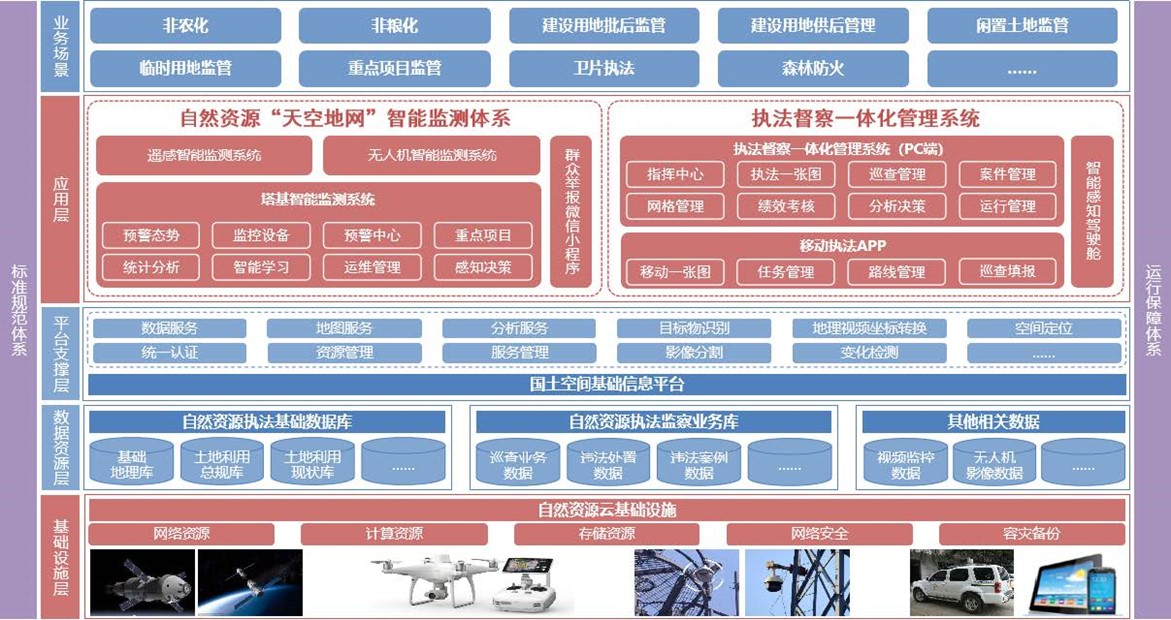 執(zhí)法督察解決方案主要包括“天空地網(wǎng)”智能監(jiān)測(cè)體系和執(zhí)法督察一體化監(jiān)管系統(tǒng)兩部分。